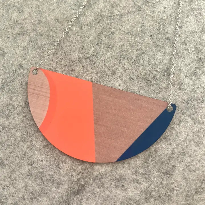 A statement necklace, with hand-printed and hand-drawn designs by Jenni Douglas.