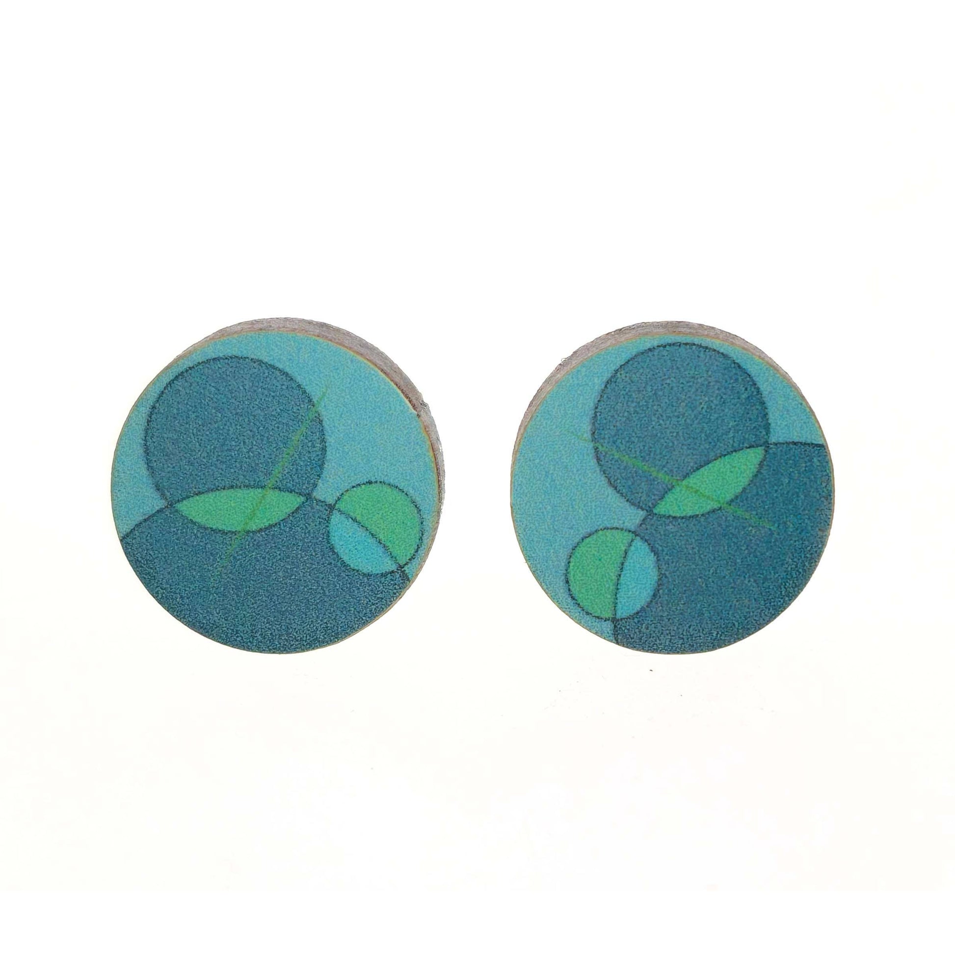 Thoughtfully crafted from wood, these lightweight studs measure approximately 13mm in diameter—perfect for comfortable all-day wear. The design is carefully printed onto the wood base, highlighting the beautiful interplay of circular forms in calming green tones. Finished with silver-plated posts and secure butterfly backs, these earrings combine durability with comfort. The natural wood backing adds warmth and organic texture to these modern geometric studs. Whether paired with relaxed linen or cotton, or dressed up for special occasions, these versatile studs make a discreet yet distinctive statement.