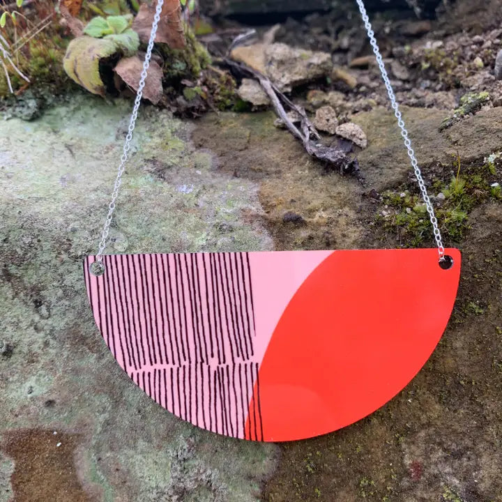 An easy to wear, statement necklace featuring distinctive hand printed designs. Pendant size: 4cm x 2cm Silver 18" chain