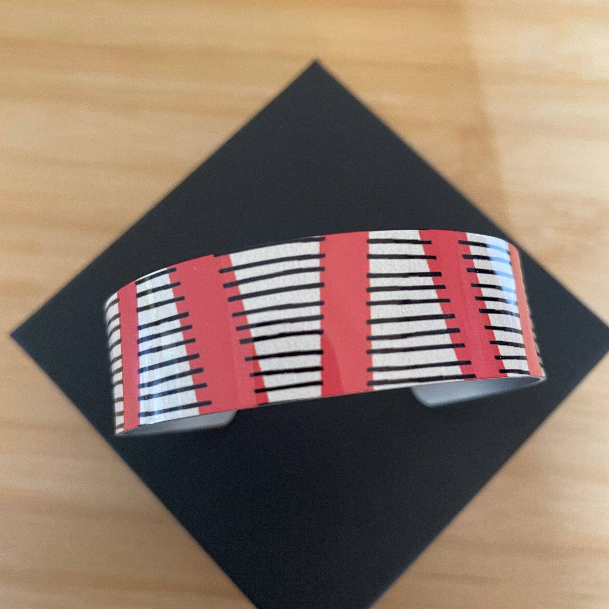 This white, red and black Vermilion s an exercise in innovative geometric design. The soft, velvet-matte finish of the architectural aluminium provides a canvas for the hand-printed artist-designed graphics by Jenni Douglas. Deep red and pale red geometric shapes are delicately hand-painted with fine black lines, and then imprinted onto the metal canvas. This bracelet offers a combination of industrial materiality with artistic imagination. At a refined scale, this bracelet augments the simplest linen dress, or crisp white shirt.
